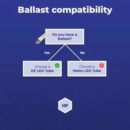 Tous les tubes fluorescents TL5 utilisent un ballast électronique (HF). Les tubes LED utilisent un ballast HF et/ou ils peuvent être installés directement sur 230V (Mains / AC). S'ils fonctionnent sur les deux, on dit qu'ils sont universels (UN). Ce tube fluorescent T5 LED de Budgetlight fonctionne avec un .