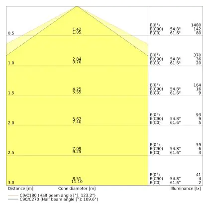 ![]() Le code couleur se compose de l'indice de rendu des couleurs (IRC) et de la température de couleur (Kelvin). Le premier chiffre indique le rendu des couleurs (1 = très mauvais rendu des couleurs, 9 = meilleure authenticité des couleurs). Le deuxième et troisième chiffre indiquent la température de la couleur. Exemple : Le code couleur "830" indique que la lampe a un bon rendu des couleurs (8) et une couleur de lumière blanche chaude (30 = 3000K). |